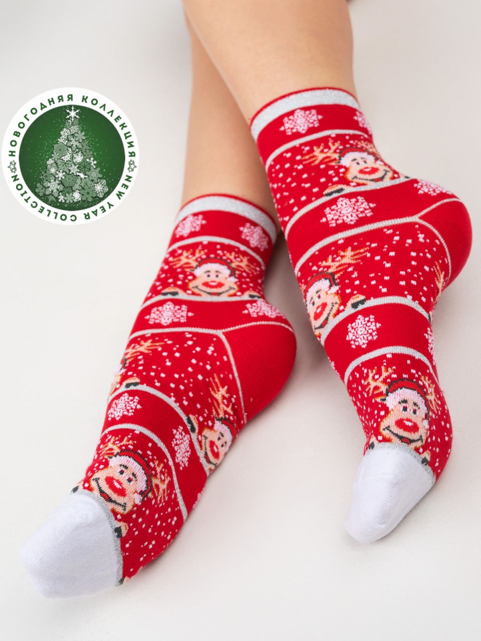 Новогодние, хлопковые женские носочки с использованием пряжи люрекс, которая придает изделию блеск, оригинальный праздничный дизайн и новогоднее настроение. Такие носочки станут особенным подарком к Новому Году!