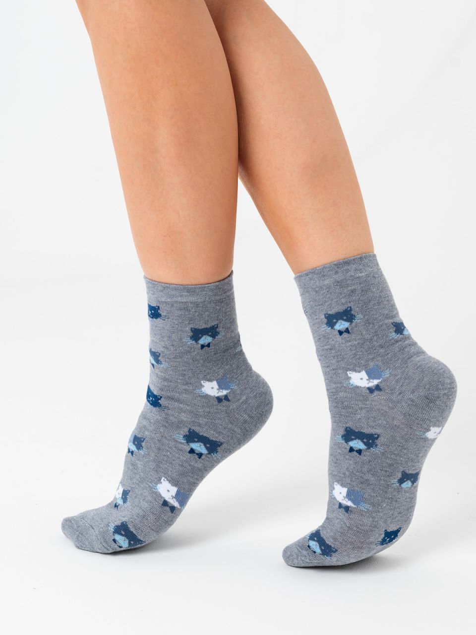 Женские носки с рисунком кошек. За счет мягкой натуральной основы из гребенного хлопка в носках будет удобно и уютно на протяжении дня. Для эластичности и повышенной устойчивости к истиранию в состав добавлены синтетические нити. Носки с привлекательным рисунком кошачьих мордочек сделают образ более стильным и подчеркнут вашу индивидуальность.