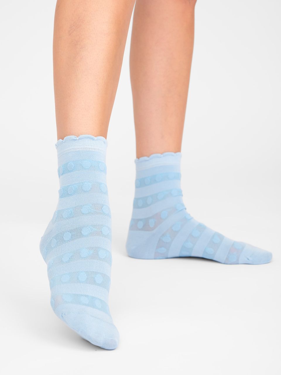 Элегантные женские носочки из бамбука с фактурным узором - крупный горох на полупрозрачных горизонтальных полосах. Невероятно нежная и женственная модель дарит своей обладательнице комфорт, уют и ощущение уверенности в своей красоте. Изящная фигурная резинка борта дополняет образ. Бамбуковая основа придает изделию мягкость.