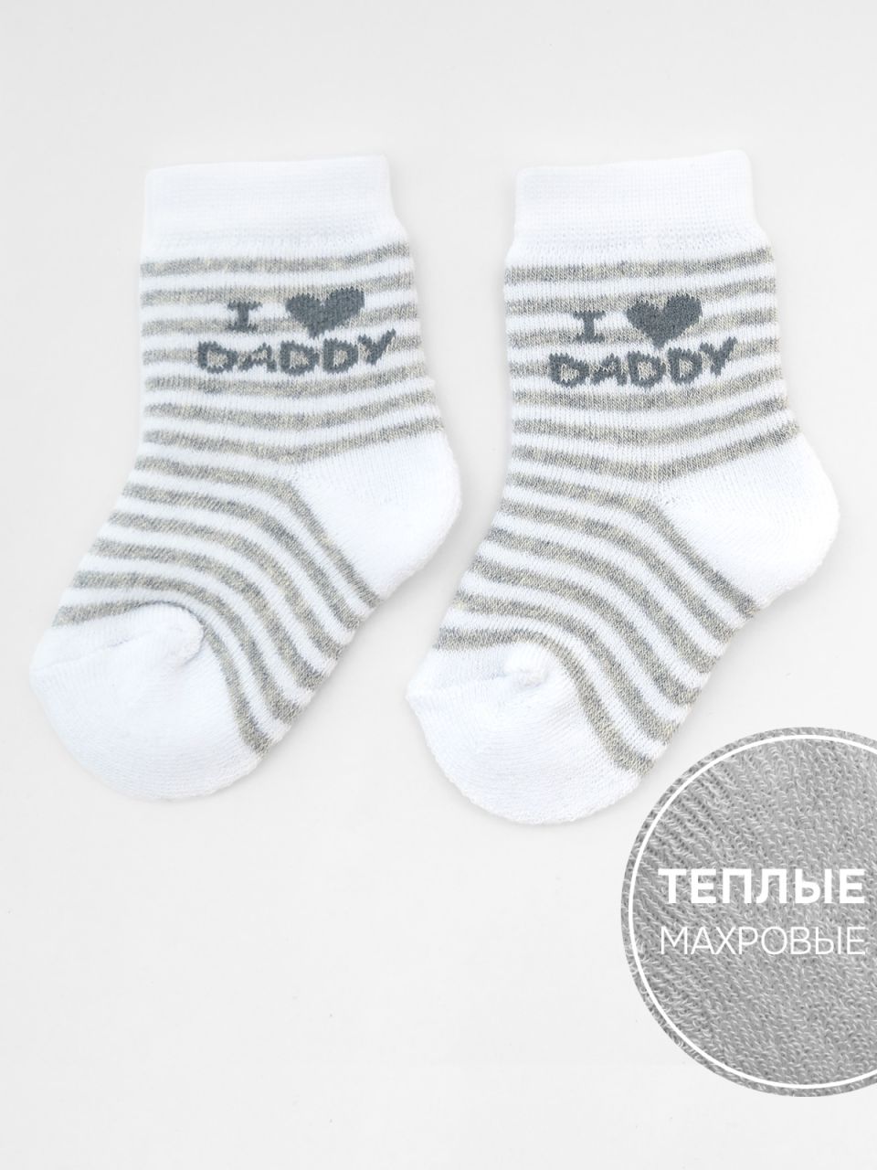 Милые носочки для самых маленьких с нежным признанием «Я люблю папу» по достоинству оценят трогательные родители. Модель представлена в двух вариантах. С серыми полосками и надписью такого же цвета. И в аналогичном виде, но с деталями в голубом оттенке. Носочки связаны из натурального гребенного хлопка, поэтому ребенку будет в них комфортно и тепло в зимнюю пору. Такую модель можно надеть как на каждый день, так и на праздник.