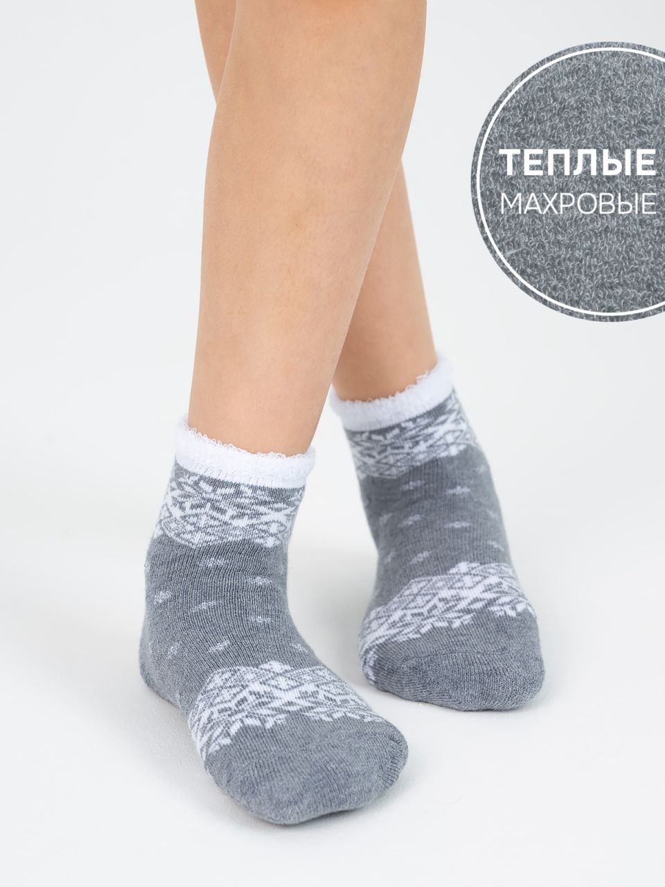 Плюшевые детские носки. Основа – натуральный гребенной хлопок, который подарит ощущения максимального комфорта и защитит ножки от холодов. Очаровательный рисунок со снежинками вдохновит и поднимет настроение. Идеальный аксессуар, способный оживить образ и согреть в зимнюю пору.