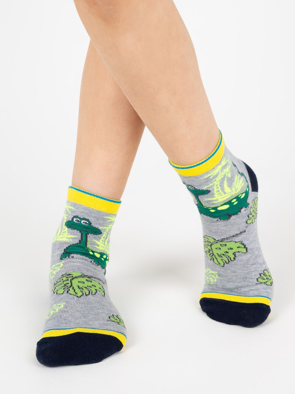 Детские демисезонные носочки с динозавриком в джунглях. Сочные цвета и дружелюбный принт придутся по вкусу любителям дино-фауны. Благодаря натуральной основе из высококачественного гребенного хлопка носочки дышащие, ножкам ребёнка комфортно и уютно на протяжении дня. Синтетические нити в составе создают прочный каркас, помогают носочкам держать форму.