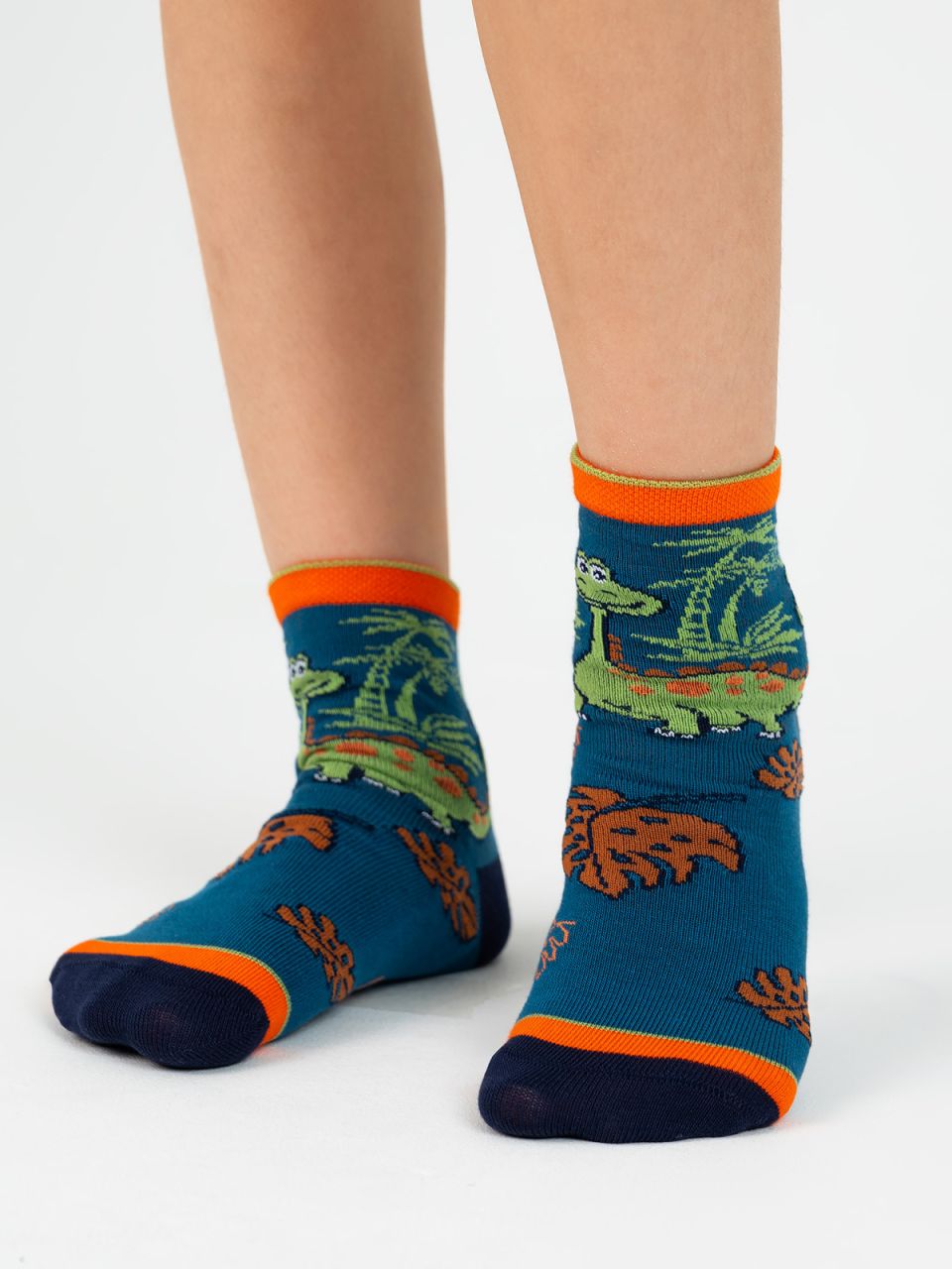 Детские демисезонные носочки с динозавриком в джунглях. Сочные цвета и дружелюбный принт придутся по вкусу любителям дино-фауны. Благодаря натуральной основе из высококачественного гребенного хлопка носочки дышащие, ножкам ребёнка комфортно и уютно на протяжении дня. Синтетические нити в составе создают прочный каркас, помогают носочкам держать форму.