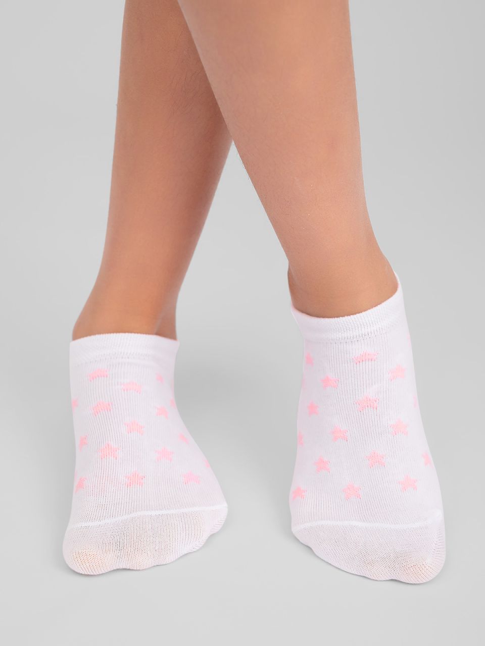 Укороченные носочки из высококачественного гребенного хлопка. Спокойные цвета фона и рисунок из крупных звёзд создают нежную модель для повседневной носки. За счёт добавления эластана носочки гибкие и надёжно фиксируются на ноге, не сползают. Полиамидные нити добавляют изделию прочности.