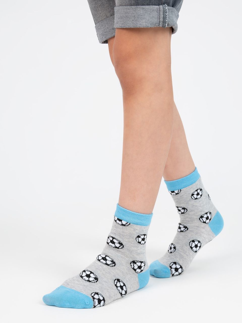 Детские демисезонные носочки в футбольной тематике - паттерн из классических чёрно-белых мячей на меланжевом фоне. Чистый голубой цвет мыска, пяточки и борта добавляет свежести. В составе носков высококачественный гребенной хлопок, для прочности и эластичности добавлены синтетические нити.