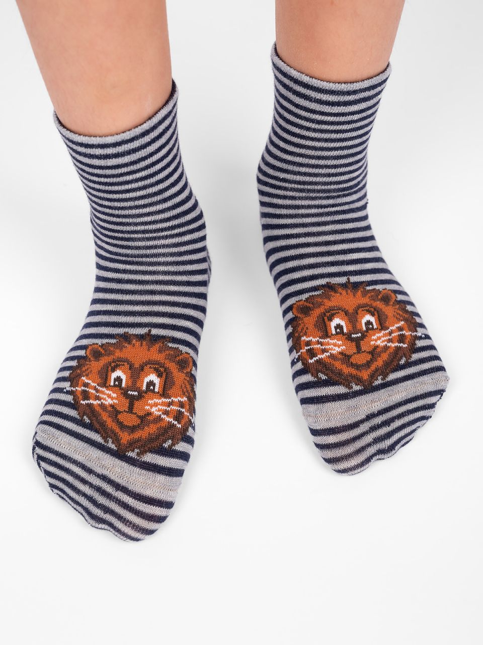 Детские полосатые носки. Связаны из натурального гребенного хлопка, отличающимся своим удобством и комфортом: он мягок, прост в уходе и хорошо пропускает воздух. Носочки с ярким рисунком льва, без сомнений, порадуют и покорят сердце вашего ребёнка.