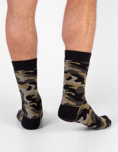 Мужские носки с камуфляжным рисунком. Изделие из натурального гребенного хлопка гарантирует лёгкость и комфорт в каждом шаге. Классическая модель подчеркнёт повседневный образ или дополнит экипировку. Такие носки послужат прекрасным дополнением для подарка.