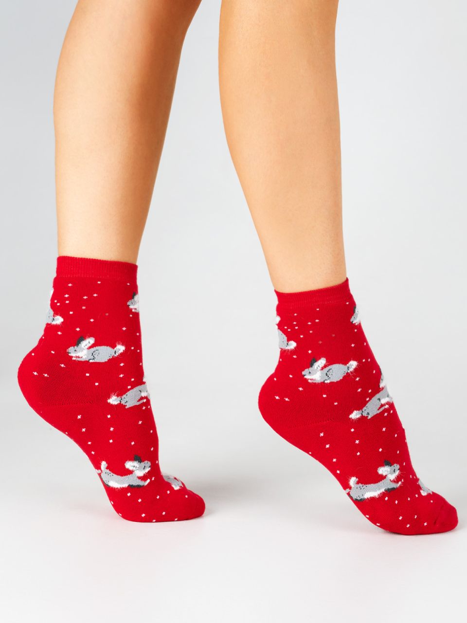 Очаровательные зимние носки с изображением кролика. Изделие выполнено из натурального гребенного хлопка и подходит для повседневной носки. Носочки подарят вам праздничное настроение, согреют ножки прохладными вечерами и станут отличным подарком для себя и для близких.