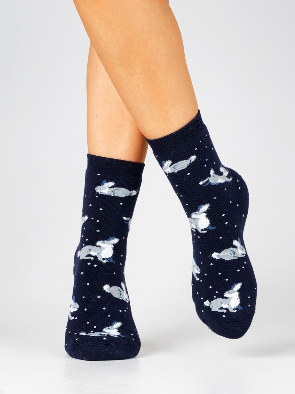 Очаровательные зимние носки с изображением кролика. Изделие выполнено из натурального гребенного хлопка и подходит для повседневной носки. Носочки подарят вам праздничное настроение, согреют ножки прохладными вечерами и станут отличным подарком для себя и для близких.