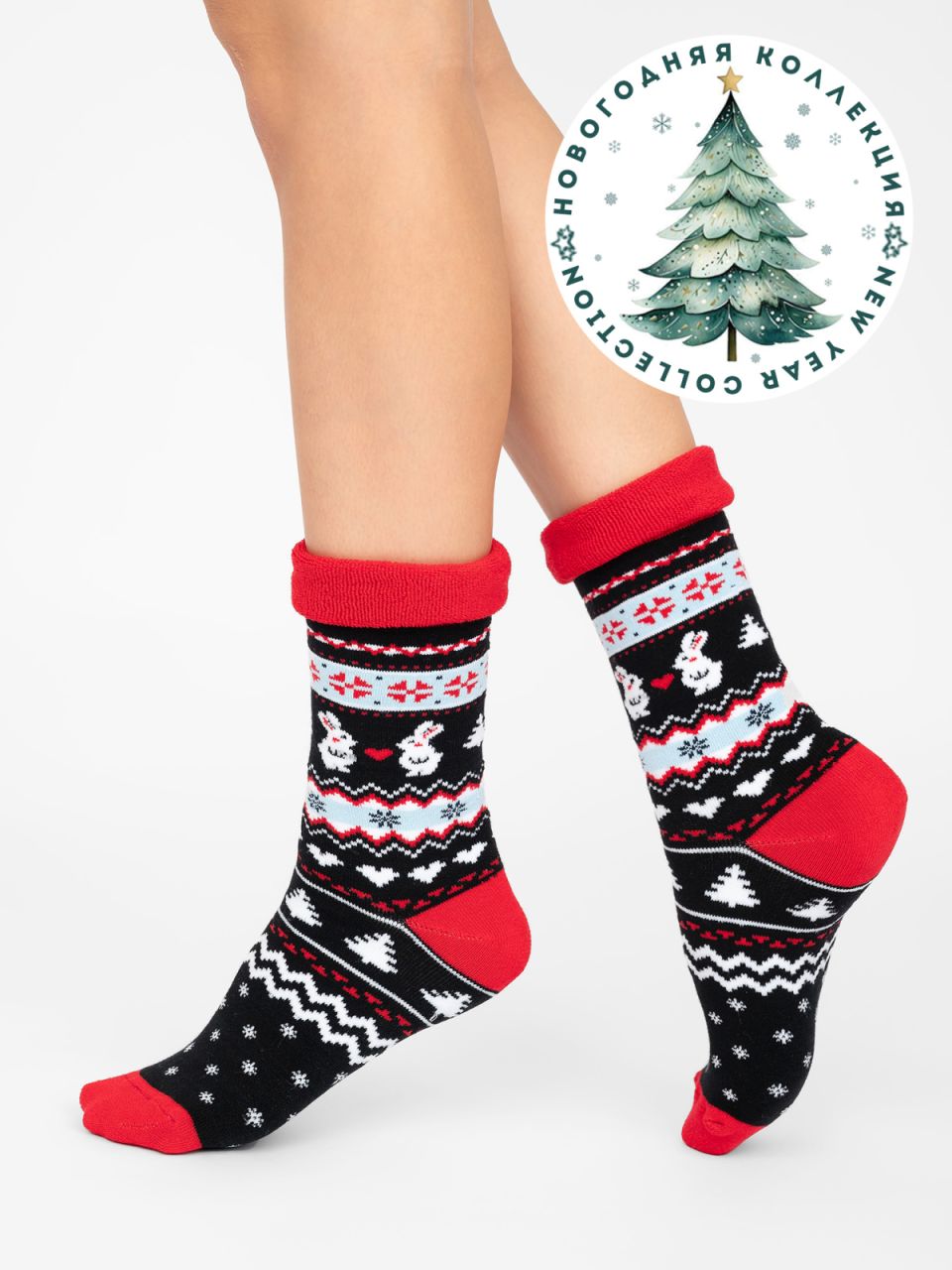 Женские новогодние носки. Креативная модель с мягким бортом связана из натурального гребенного хлопка - это комфорт и забота для ваших ног. Веселые рисунки и праздничные цвета поднимут настроение вам и вашим близким и подарят ощущение сказки. Носочки станут прекрасным дополнением к зимнему гардеробу.