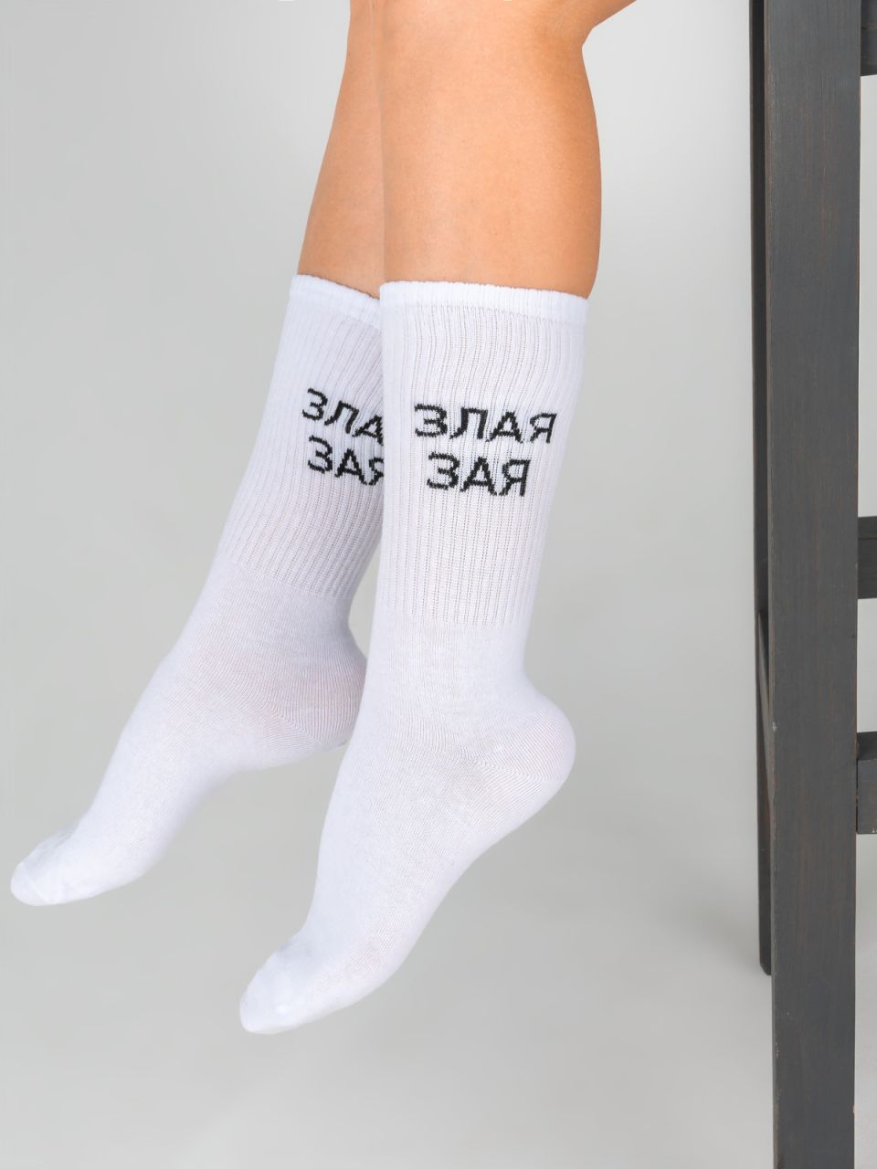 Стильные женские носки с надписью «Злая зая». Модель выполнена из натурального гребенного хлопка, который подарит ощущения мягкости и максимального комфорта вашим ногам. Синтетические нити в составе обеспечат эластичность и устойчивость к истиранию. Носки в белоснежном цвете с оригинальной надписью на паголенке станут идеальным аксессуаром к образу, который подчеркнет вашу индивидуальность.