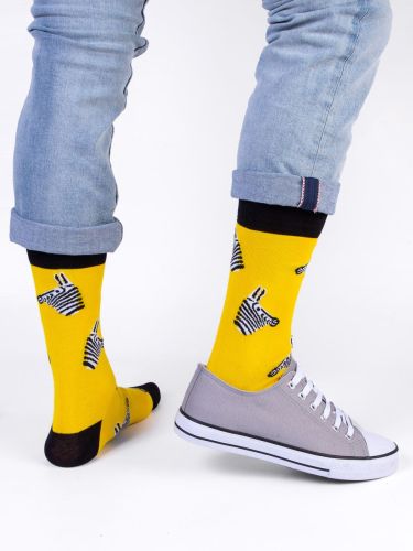 Яркие демисезонные мужские носки с рисунком зебры. Изделие связано из натурального гребенного хлопка, комфортное, воздухопроницаемое, гигроскопичное. Акцентный борт и мысок изделия сочетаются с рисунком. Креативные носки для стильных мужчин станут отличным дополнением к образу.
