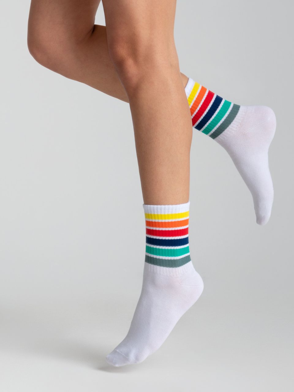 Яркие детские носки сцветными полосами на паголенке. Связаны из натурального хлопка, что делает модель максимально комфортной и позволяет ножкам «дышать», препятствуя раздражению кожи. Эластичная резинка фиксирует посадку изделия и не сдавливает ногу. Разноцветный полосатый рисунок поднимет настроение и дополнит образ красками.