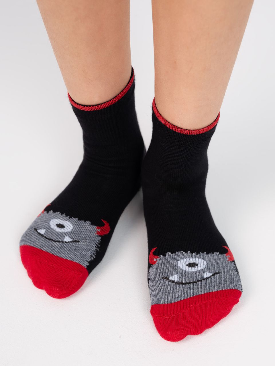 Детские носки с монстром, изображенным на мыске изделия. Связаны из натурального гребенного хлопка, благодаря чему ребёнок будет чувствовать себя комфортно в течение всего дня. Модель отличается своей эластичностью и устойчивостью к истиранию. Фантазийный рисунок поднимет настроение и дополнит яркими красками повседневный образ.