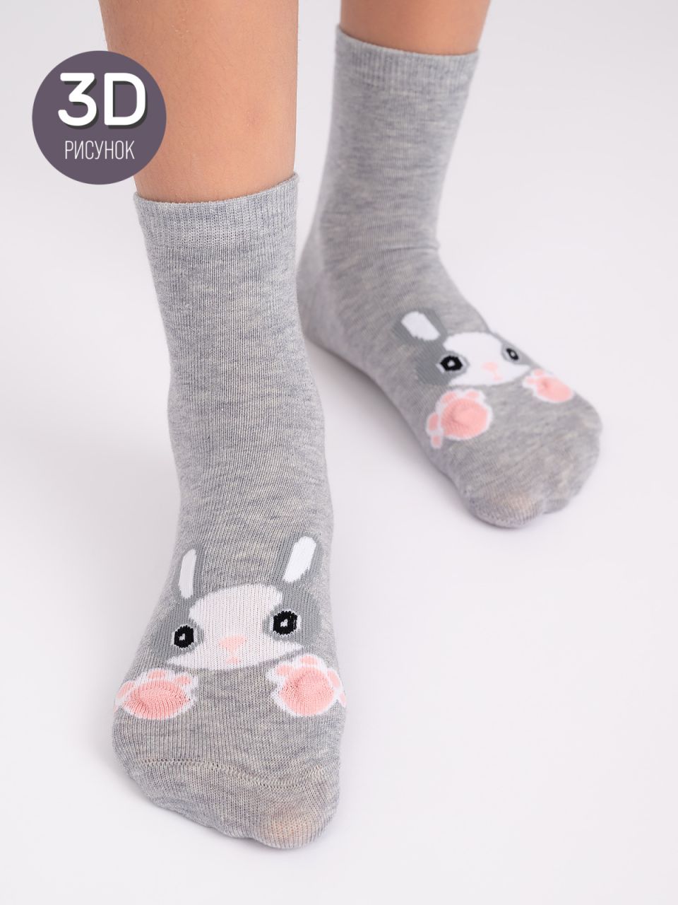 Детские носки с зайчиком. Модель связана из натурального гребенного хлопка, благодаря этому, очень комфортная, мягкая, воздухопроницаемая. Эластичная резинка фиксирует посадку изделия и не сдавливает ножку. Очаровательный 3-D рисунок зайчика непременно порадует как ребенка, так и его родителей.