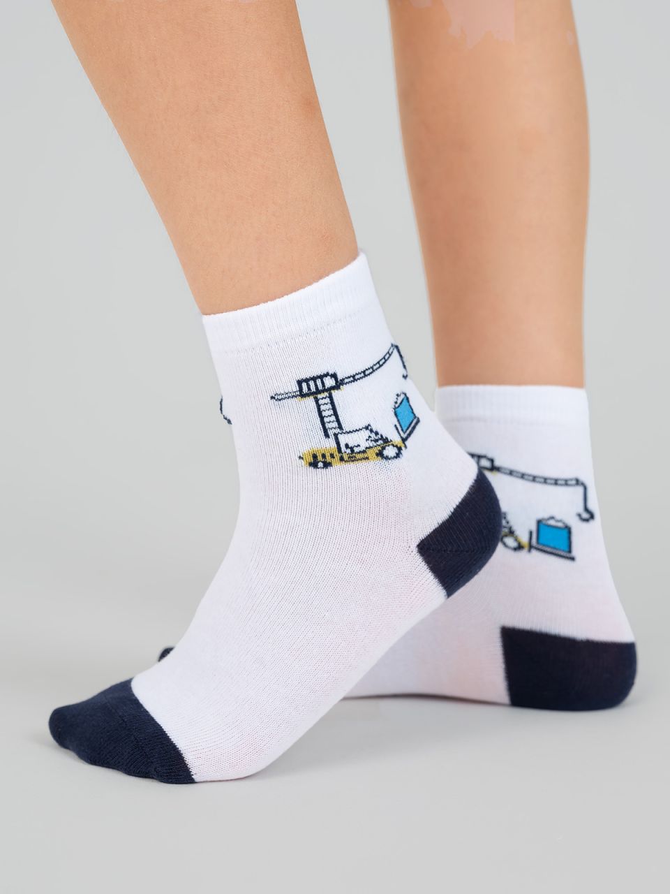 Детские носки с рисунком подъёмного крана. У модели мягкая основа из натурального хлопка, которая подарит ножкам ощущения уюта и максимального комфорта. Изделие обладает воздухопроницаемостью и защитит нежную кожу ног от раздражений. Забавный дизайн порадует и впечатлит юного обладателя.