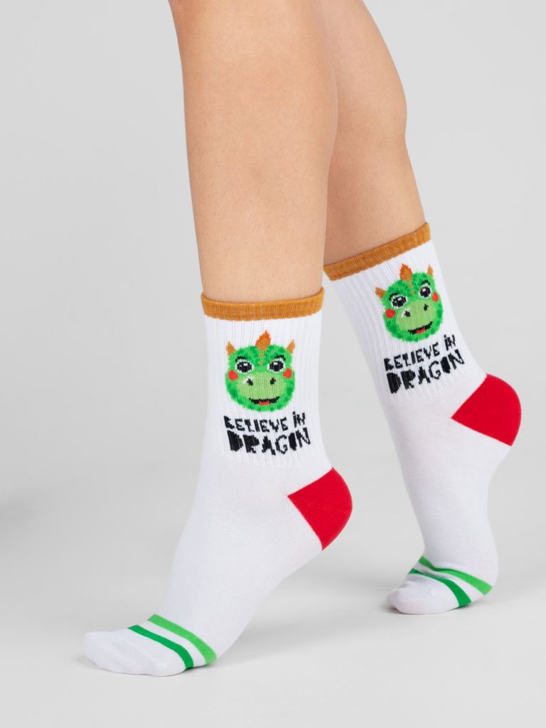 Детские носки. Модель, связанная из натурального хлопка, находка для маленьких ножек. Носочки с креативным дизайном и очаровательным рисунком дракончика на паголенке покорят сердце как детей, так и их родителей. Комфортное, дышащие изделие станет незаменимым элементом в детском гардеробе.