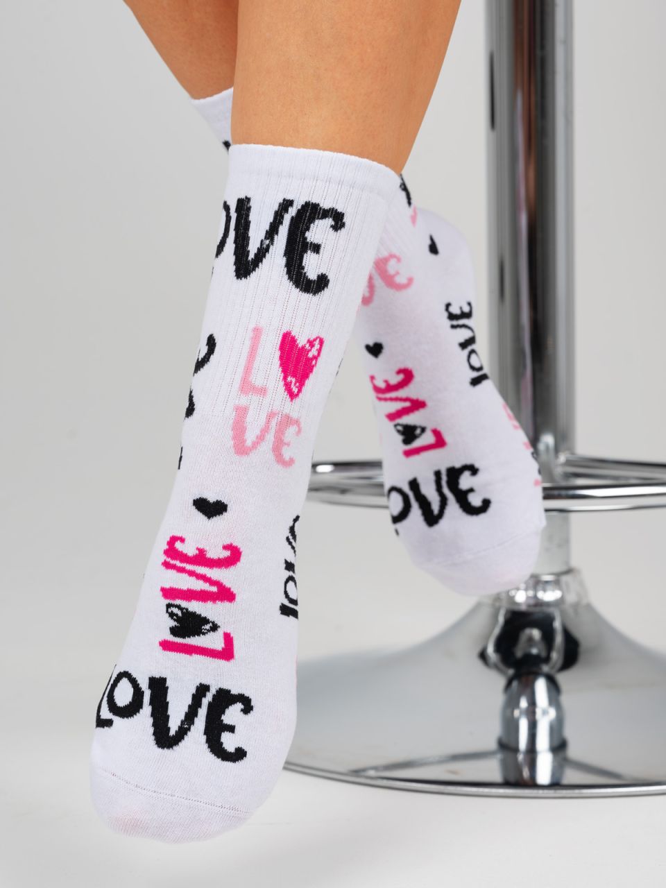 Женские демисезонные носки в романтичном стиле. Модель связана из натурального гребенного хлопка, комфортная и тактильно приятная. Спортивная резинка плотно облегает ногу, не стягивая ее и не доставляя дискомфорт во время носки. Очаровательный дизайн с рисунком-надписью LOVE и сердечками покорит самую романтичную натуру.