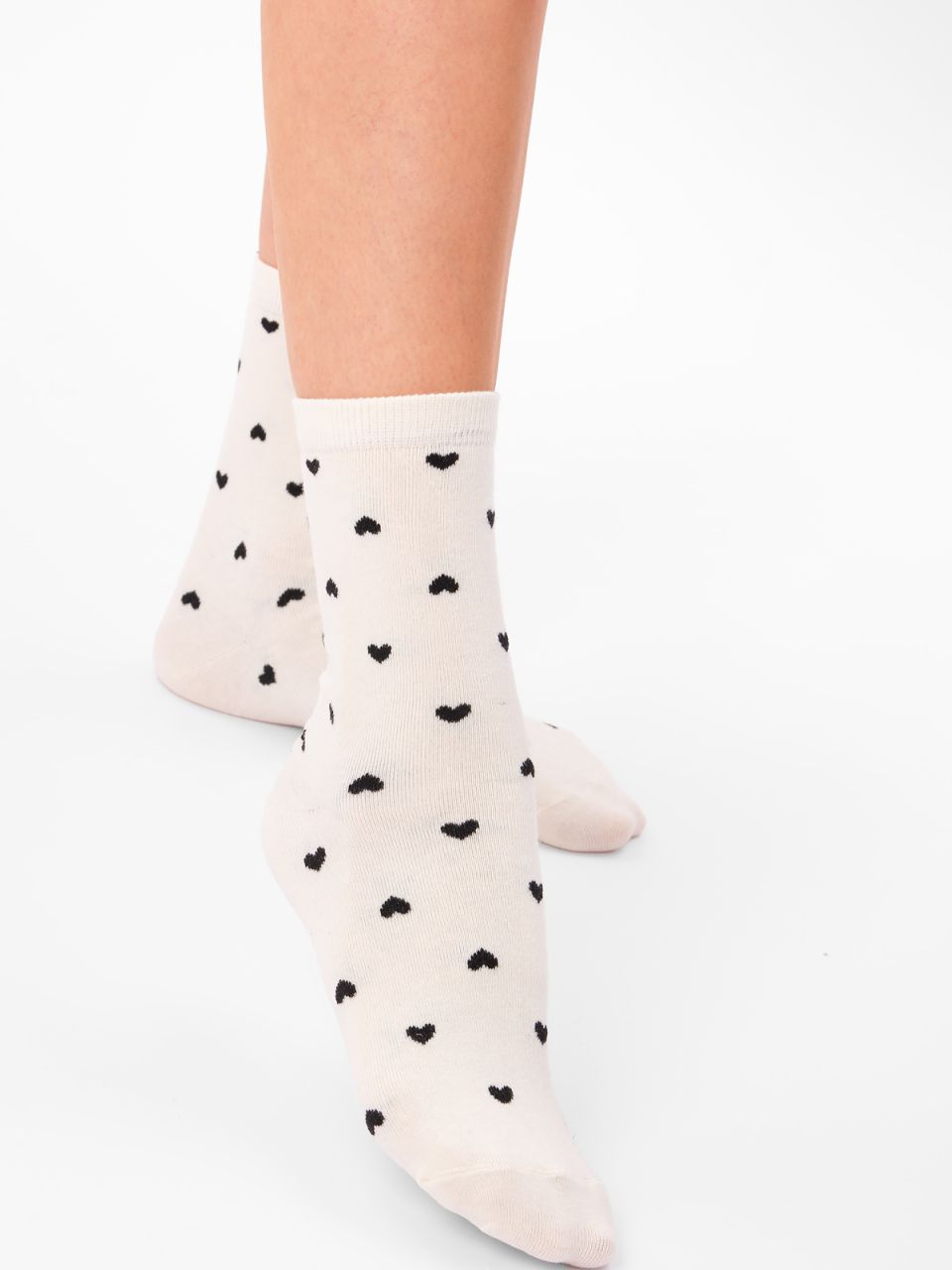Женские носки с рисунком. Очаровательная модель связана из натурального гребенного хлопка, благодаря этому обладает повышенной мягкостью и комфортом. Носки с сердечками дополнят ваш образ и придадут ему притягательности и легкой игривости.