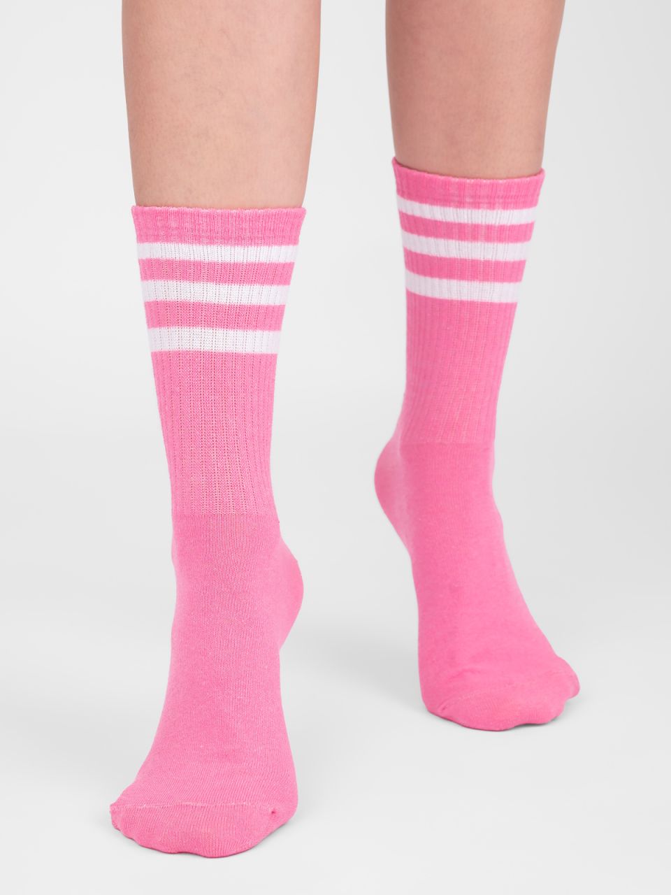 Женские демисезонные носки. Изделие связано из хлопкосодержащей пряжи и обладает хорошей растяжимостью, что гарантирует мягкость и комфорт в течение всего дня. Розовый цвет в сочетании с контрастными полосками придают модели индивидуальный стиль. Спортивная резинка нежно облегает ногу, не сползая и не доставляя неприятных ощущений.