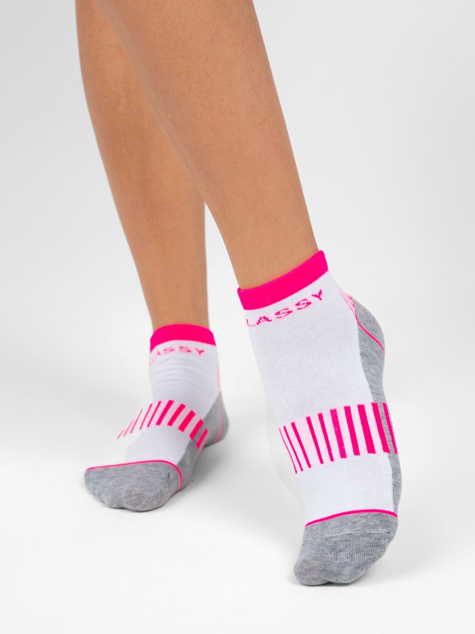 Стильные детские носочки для занятий спортом. Носки обращают на себя особое внимание модной цветовой гаммой - оттенки спокойного серого, белый и неоновые полосы. Надпись "CLASSY" на передней части паголенка высококлассно презентует своего обладателя. Укороченный паголенок обрамлён упругой резинкой, которая прочно фиксирует носок на ножке. Гармоничное сочетание хлопковой основы и синтетических нитей создаёт комфортное, прочное, устойчивое к растяжению изделие.