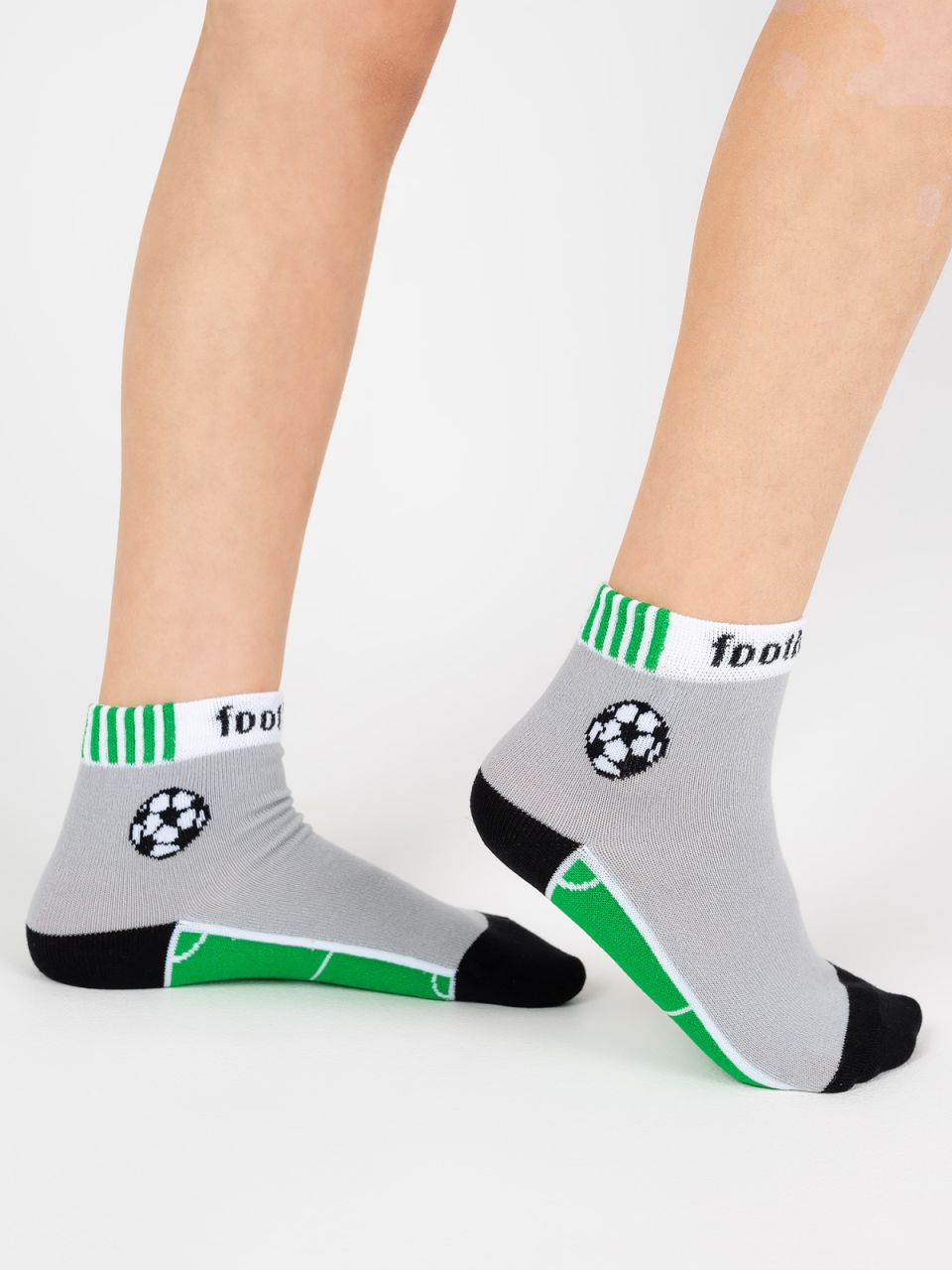 Детские демисезонные носочки в спортивном стиле. Стилизация следа под футбольное поле, "летящий" мяч на щиколотке, яркие цвета - всё это привлекает внимание не только любителей футбола, но и просто активных жизнерадостных мальчишек. У носочков натуральная хлопковая основа, благодаря которой ножки ребёнка дышат на протяжении всего дня. Упругая и эластичная резинка борта надёжно фиксирует носки на ногах.