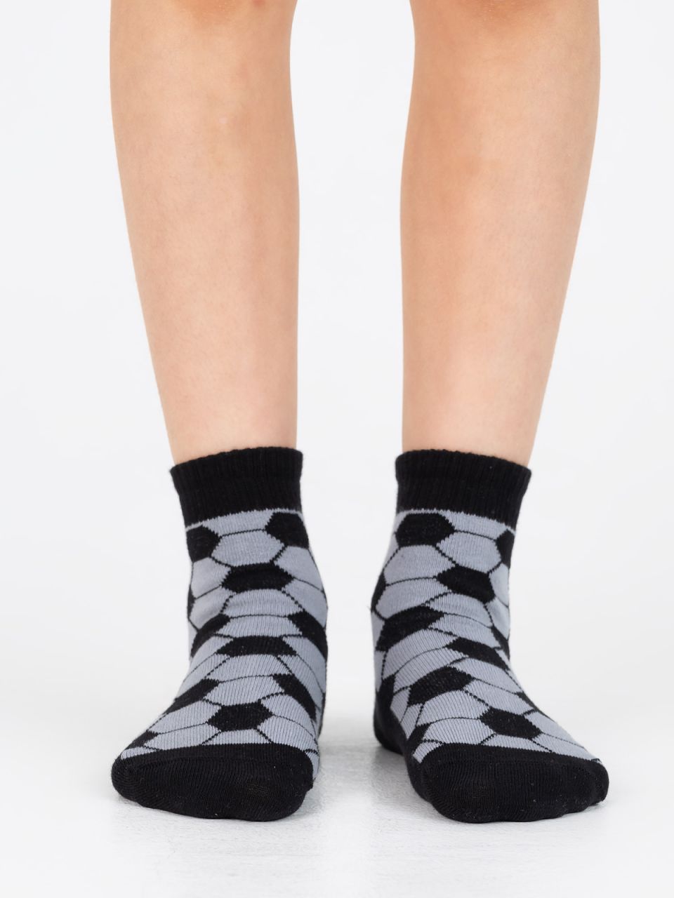 Детские демисезонные носочки в спортивной тематике. Стилизация носка под футбольный мяч привлекает внимание. Однотонными чёрными остаются след, мысок, пятка и борт. Модель предназначена как для занятий спортом, так и для повседневной носки. Ножкам ребёнка будет комфортно благодаря натуральной хлопковой основе. Добавление синтетических нитей укрепляет изделие и повышает его износостойкость. Непременный выбор активных, спортивных детей и любителей футбола.