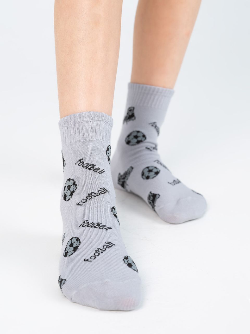 Детские демисезонные носочки в футбольной тематике. Рисунок из мячей, кед и надписей "Football" уносит мысли в детство и рождает воспоминания про дворовую футбольную команду и матчи с утра до вечера. У носочков комфортный состав - высококачественный гребенной хлопок и синтетические нити. Носки мягкие, крепкие, эластичные и с высокой терморегуляцией. Удачный выбор для занятий спортом.