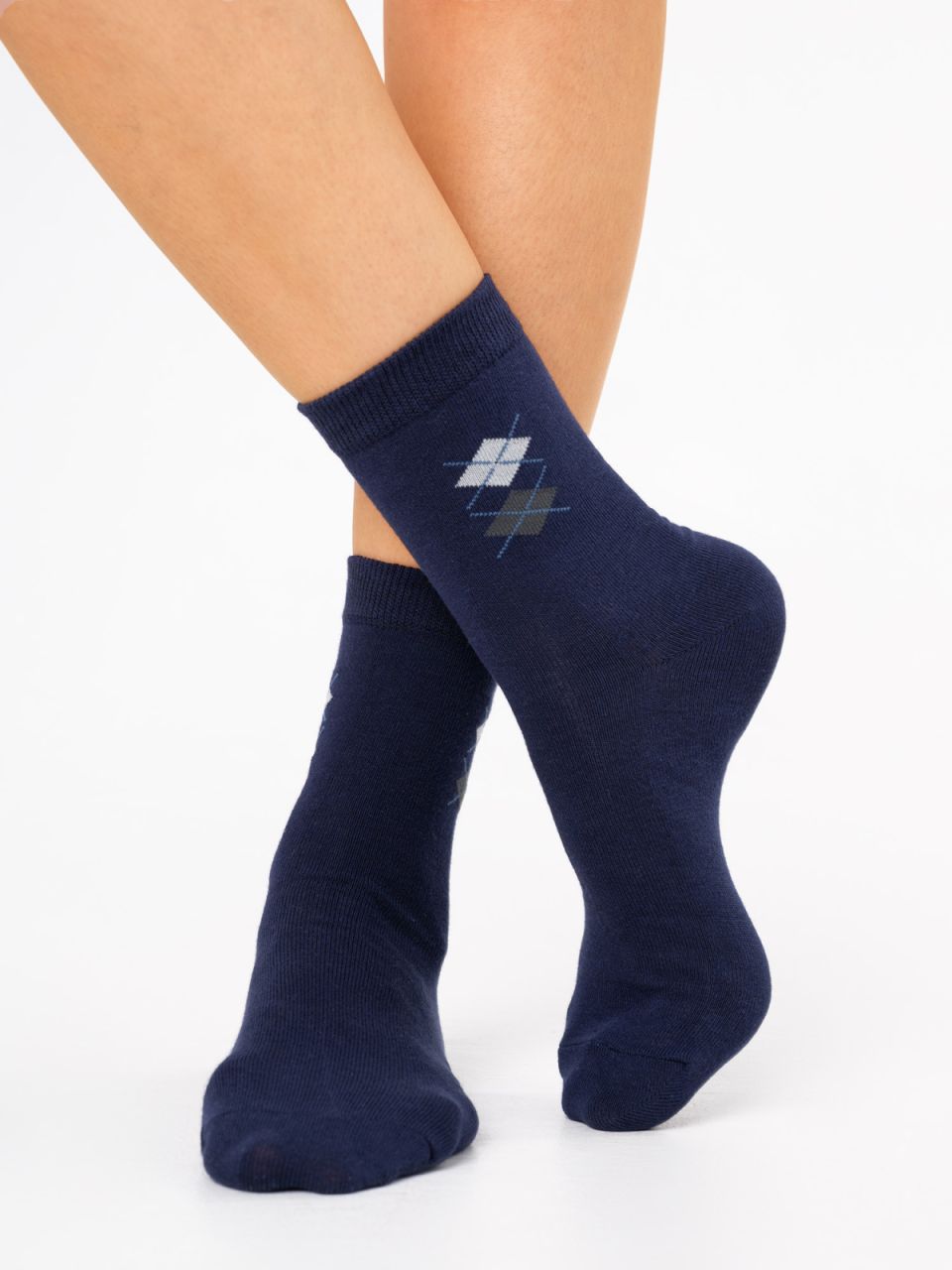 Детские демисезонные носочки с геометрическим рисунком из ромбов на щиколотке. Однотонный фон в тёмных тонах и неброский классический орнамент создают удачную модель для повседневного гардероба ребёнка, носочки идеально дополняют школьную форму. Натуральная основа из высококачественного гребенного хлопка способствует высокой терморегуляции. Добавление синтетических нитей укрепляет изделие и повышает его износостойкость.