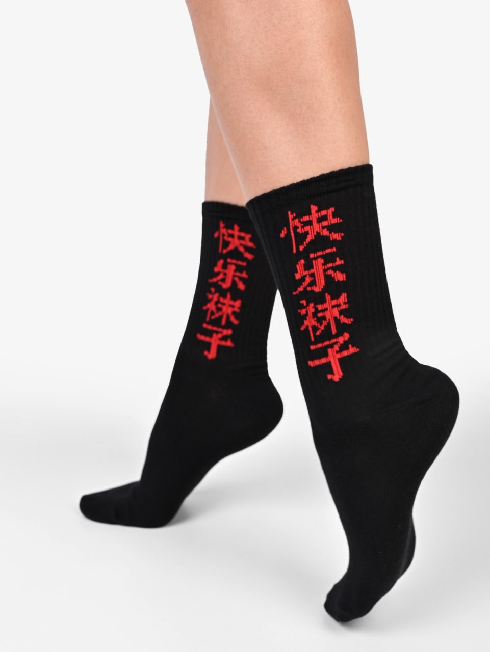 Детские демисезонные носки в тренде современной молодёжи. Оригинальный дизайн с японским иероглифом, который переводится как "Счастливый". Контрастное сочетание классического фона, чёрного или белого, с красными знаками выглядит стильно и ярко. Высокий паголенок с имитацией резинки надёжно фиксирует носки на ногах подростка. У носочков натуральная хлопковая основа. Модель сочетается с кроссовками и короткими шортами или джинсами.