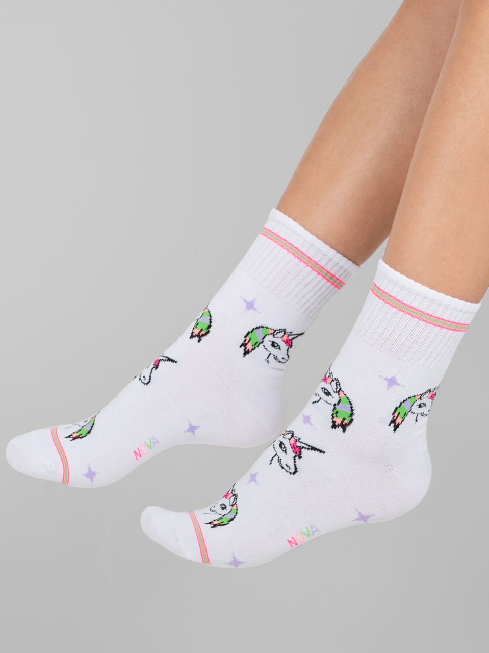 Подростковые носочки с популярным изображением единорогов. Образ этого волшебного животного любят и нежные принцессы, и отчаянные пацанки. Гармоничное сочетание натуральной основы из высококачественного гребенного хлопка и синтетических нитей создаёт комфортное, прочное изделие, устойчивое к истиранию и деформации.