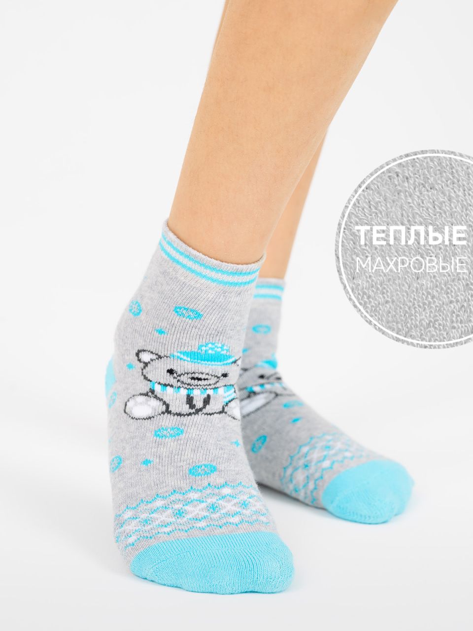 Милые носочки для девочки с изображением мишки в шапке и шарфе. Борт модели украшен нитями люрекса. Носочки представлены в четырех цветовых решения: серо-синем, серо-розовом, бело-розовом и серо-голубом. Натуральный хлопок, из которого изготовлены носочки отлично впитывает влагу, удобен в носке, дарит ощущение легкости и защищает от холода.