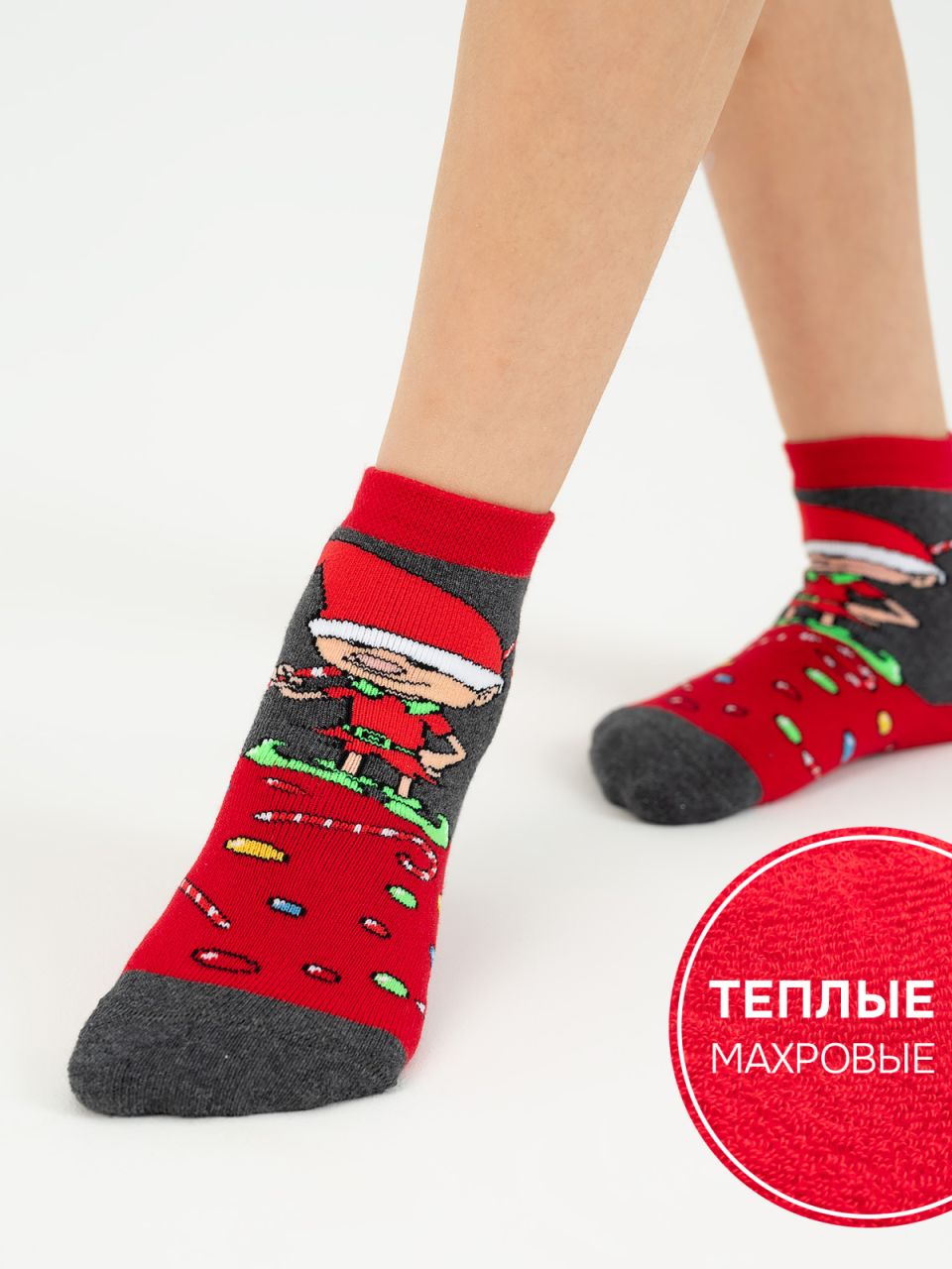 Любители сказок и волшебства будут в восторге от носочков с помощником Санты-Клауса – эльфом, который держит в руках сладкий леденец. По всей длине носка также запечатлена россыпь желанных сладостей. Модель представлена в трех вариантах: в красно-сером, бирюзово-сером и сине-голубом, где даже эльфик меняет окрас своего наряда. Такой выбор позволит наверняка найти нужную пару для ребенка. Носочки связаны из натурального хлопка, который обладает отличным согревающим свойством, поэтому даже в зимние морозы ножка будет защищена.