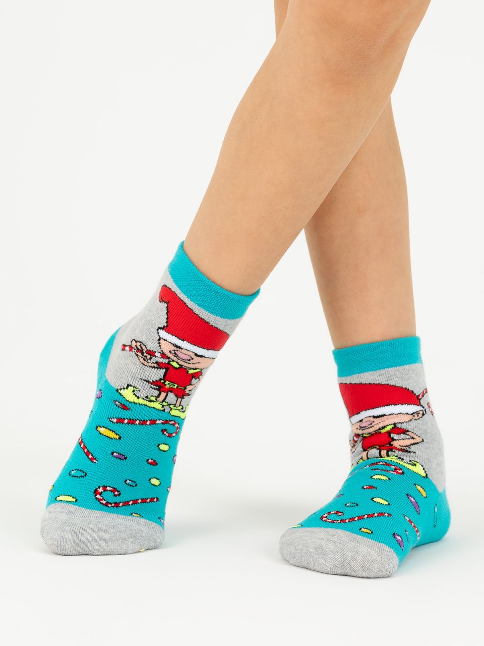 Любители сказок и волшебства будут в восторге от носочков с помощником Санты-Клауса – эльфом, который держит в руках сладкий леденец. По всей длине носка также запечатлена россыпь желанных сладостей. Модель представлена в трех вариантах: в красно-сером, бирюзово-сером и сине-голубом, где даже эльфик меняет окрас своего наряда. Такой выбор позволит наверняка найти нужную пару для ребенка. Носочки связаны из натурального хлопка, который обладает отличным согревающим свойством, поэтому даже в зимние морозы ножка будет защищена.