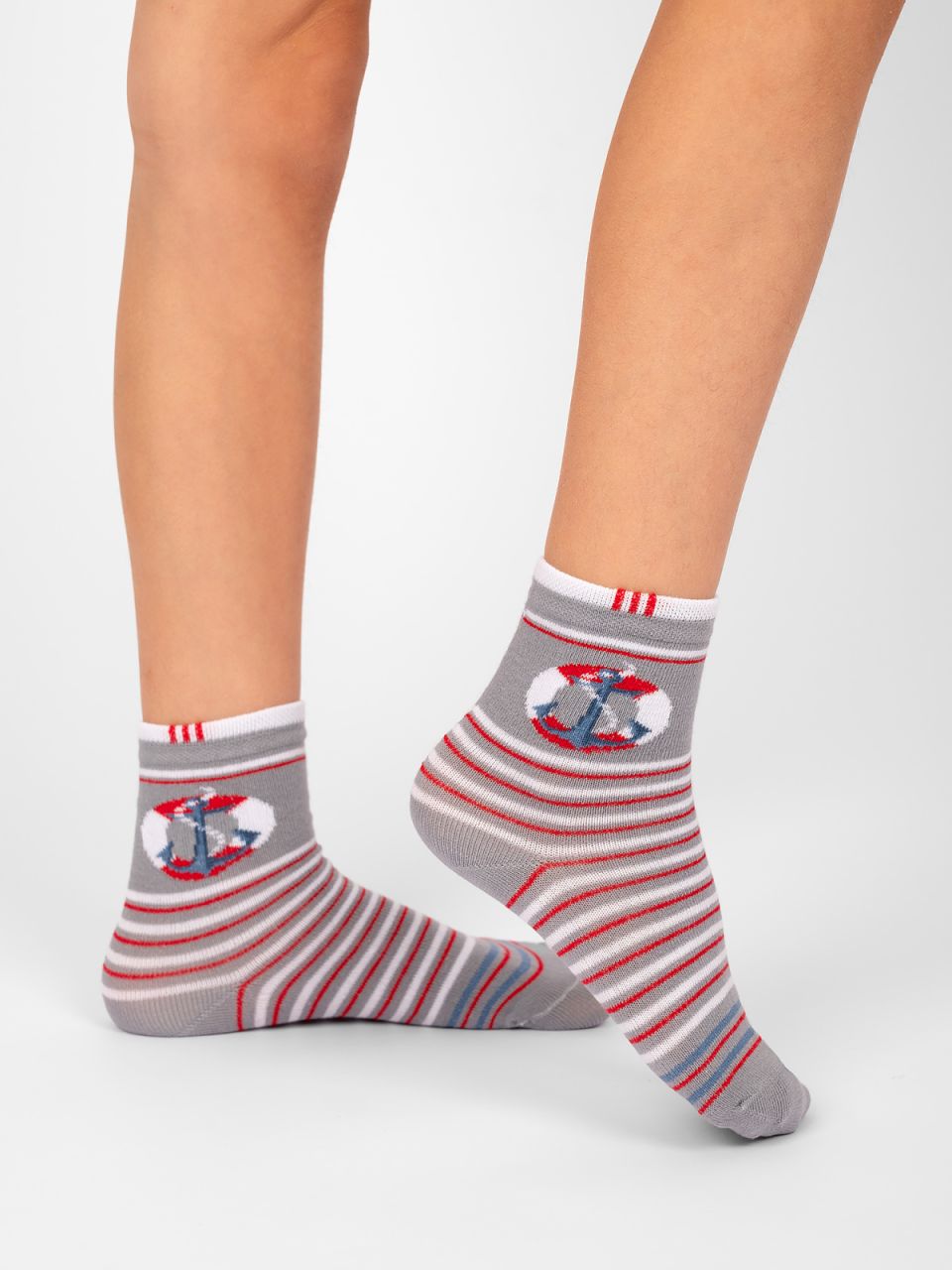Полосатые детские носки. Модель из натурального гребенного хлопка не теряет форму, хорошо тянется и плотно облегает стопу ребёнка, обеспечивая максимальный комфорт в каждом шаге. Стильная контрастная полоска и морской якорь создают идеальный тандем для маленького любителя путешествий.