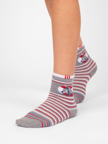 Полосатые детские носки. Модель из натурального гребенного хлопка не теряет форму, хорошо тянется и плотно облегает стопу ребёнка, обеспечивая максимальный комфорт в каждом шаге. Стильная контрастная полоска и морской якорь создают идеальный тандем для маленького любителя путешествий.