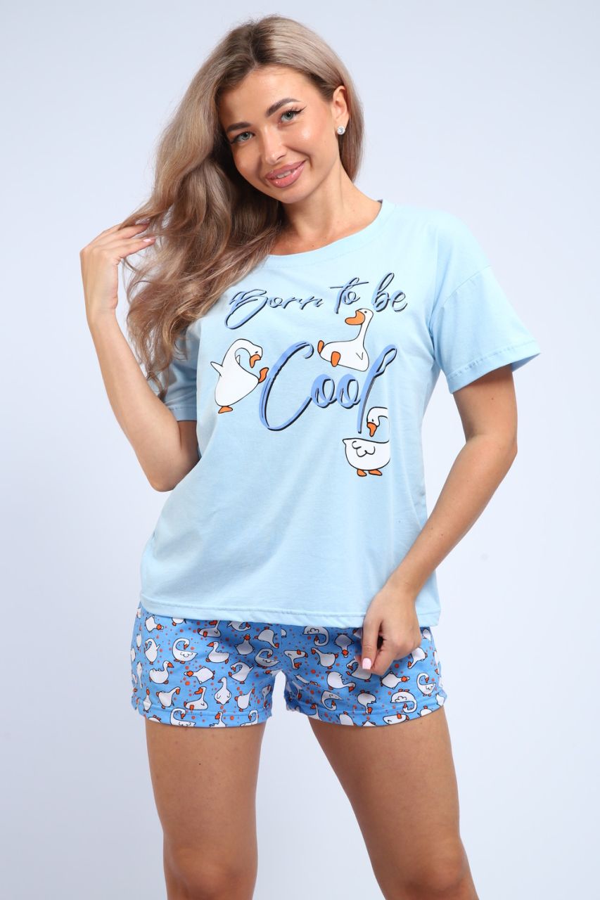 Женская пижама с шортами. Шорты на резинке с карманами. Футболка с обтачко горловины, передняя полочка с печатью.
