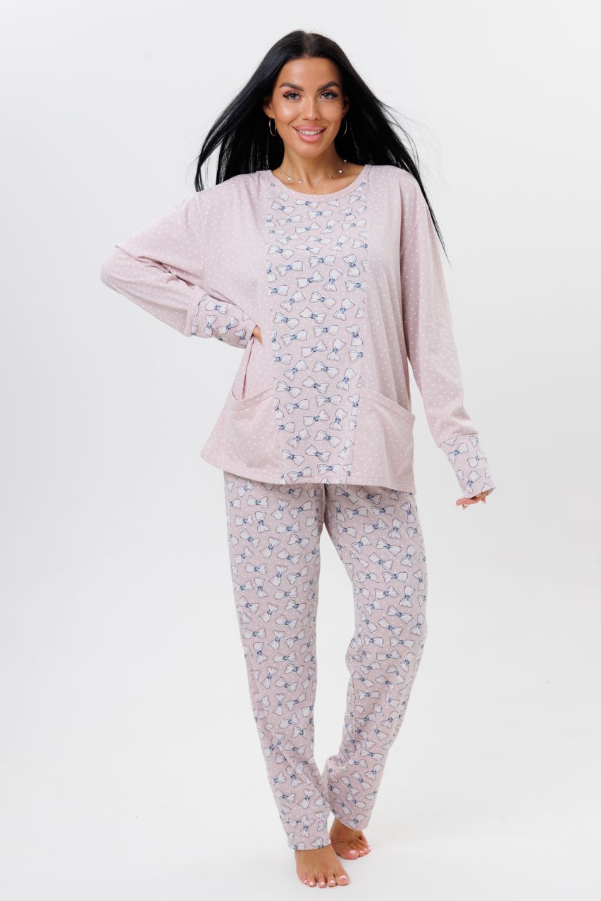 Пижама выполнена из трикотажного полотна кулирки со 100 % хлопком. Пижама состоит из кофты и брюк. Кофта с круглым вырезом, длинными рукавами с манжетами. Перед и манжеты рукава декорированы тканью компаньоном. Накладные карманы спереди входят в рельеф вставки. Брюки с манжетами на широкой резинке изготовлены из ткани компаньона.