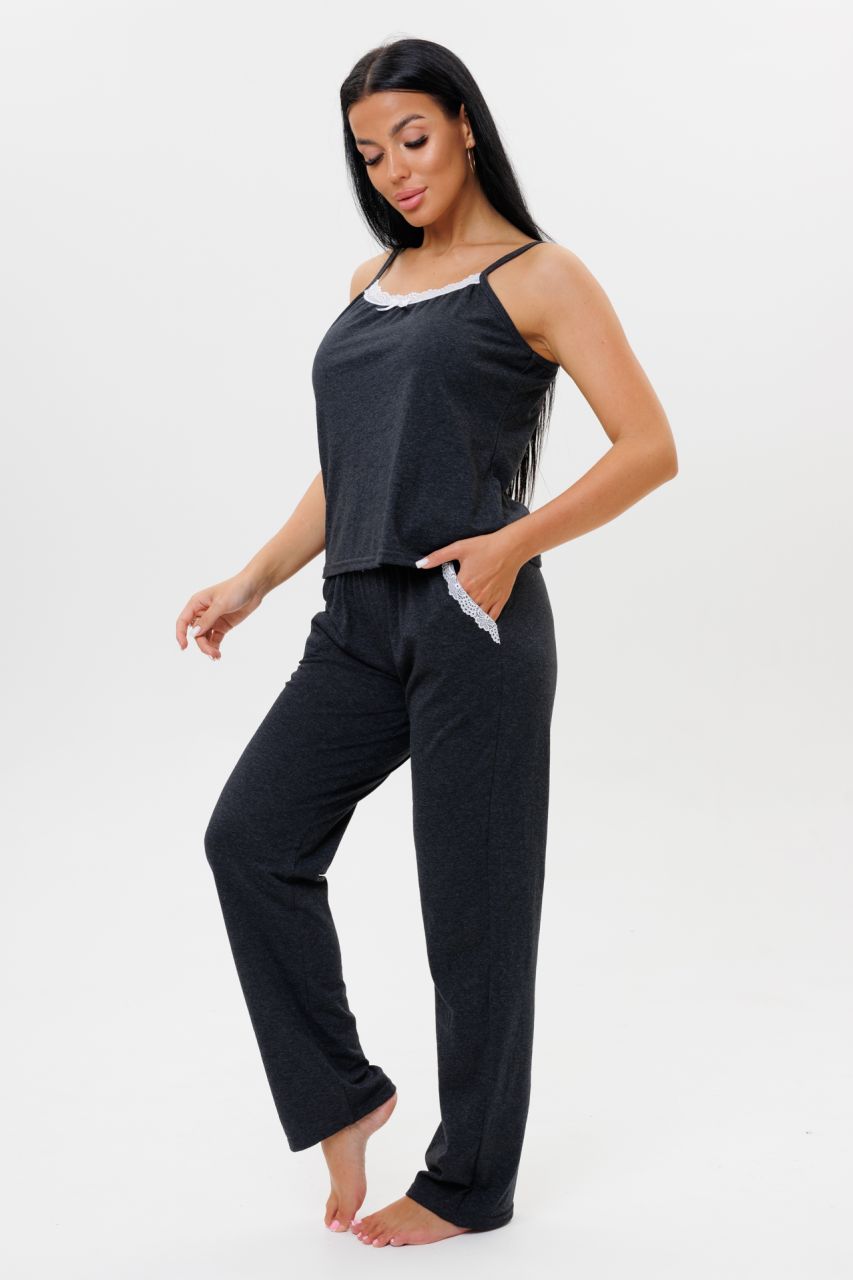 Пижама сшита из трикотажного полотна кулирки с содержанием 50 % хлопка. Пижама состоит из топа и брюк. Топ на тонких лямках отделан по линии выреза кружевом с бантом. Брюки прямого кроя на широкой резинке с бантом дополнены по бокам карманами, которые декорированы кружевом.