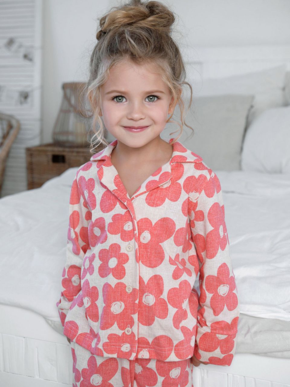 Яркая детская пижама из мягкого хлопкового трикотажа с крупным цветочным принтом. Натуральная ткань дышит и приятно ощущается на коже, обеспечивая комфорт во сне. Свободный крой и застёжка на пуговицы делают модель удобной и стильной.