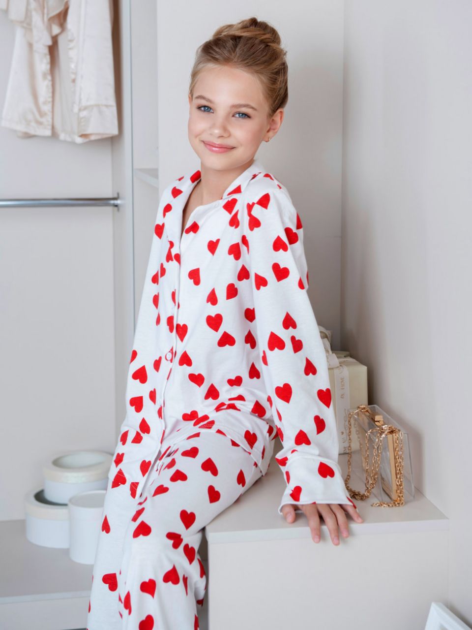 Нежная детская пижама из мягкого хлопка с забавным принтом в красные сердечки. Свободный крой и пуговицы создают комфорт и удобство при носке. Ткань дышит и приятна к телу. Отличный выбор для сна и домашних вечеров в уютной обстановке.