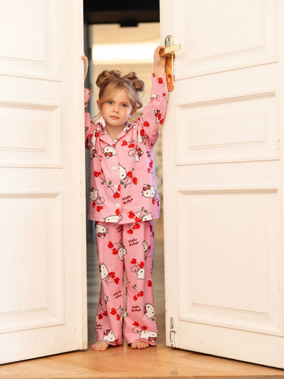 Очаровательная детская пижама из мягкого хлопка с ярким принтом Hello Kitty. Розовая ткань приятна к телу, не вызывает раздражения и легко дышит. Удобный крой с пуговицами и свободными штанами дарит комфорт и свободу движений во сне.