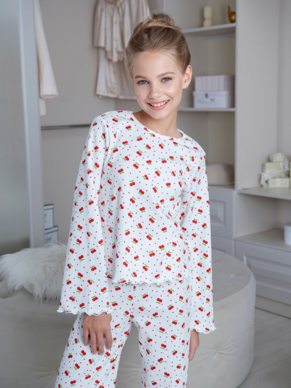 Очаровательная детская пижама из мягкого хлопкового трикотажа с принтом в яркие вишенки. Лёгкая, дышащая ткань приятна к телу и не раздражает кожу. Свободный крой и волнистая отделка придают уют и нежность. Идеальна для сна и домашних вечеров.