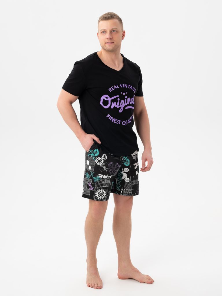 Трикотажный костюм с шортами из 100% хлопка - идеальный выбор для мужчин, которые ценят комфорт и удобство в повседневной жизни. Костюм состоит из футболки с коротким рукавом и шорт, выполненных из мягкого и приятного на ощупь материала.