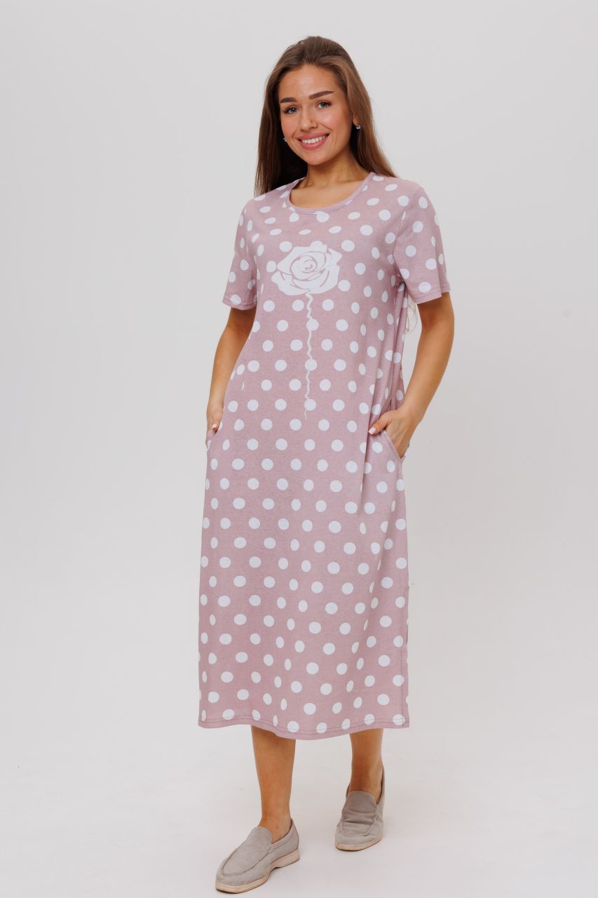 Летнее платье в горошек. Длина - ниже колена, рукава короткие.