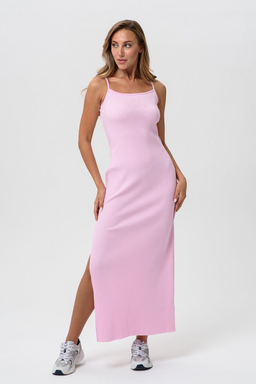 Длинное спортивное платье приталенного силуэта на тонких брительках. Мягкая ткань в рубчик обеспечивает комфорт. Идеальный вариант на каждый день или в отпуск, на море или путешествий и отдыха. Длинное сексуальное платье с разрезом идеально сочетается с любой спортивной обувью будь, то кроссовки, кеды, сандали.
