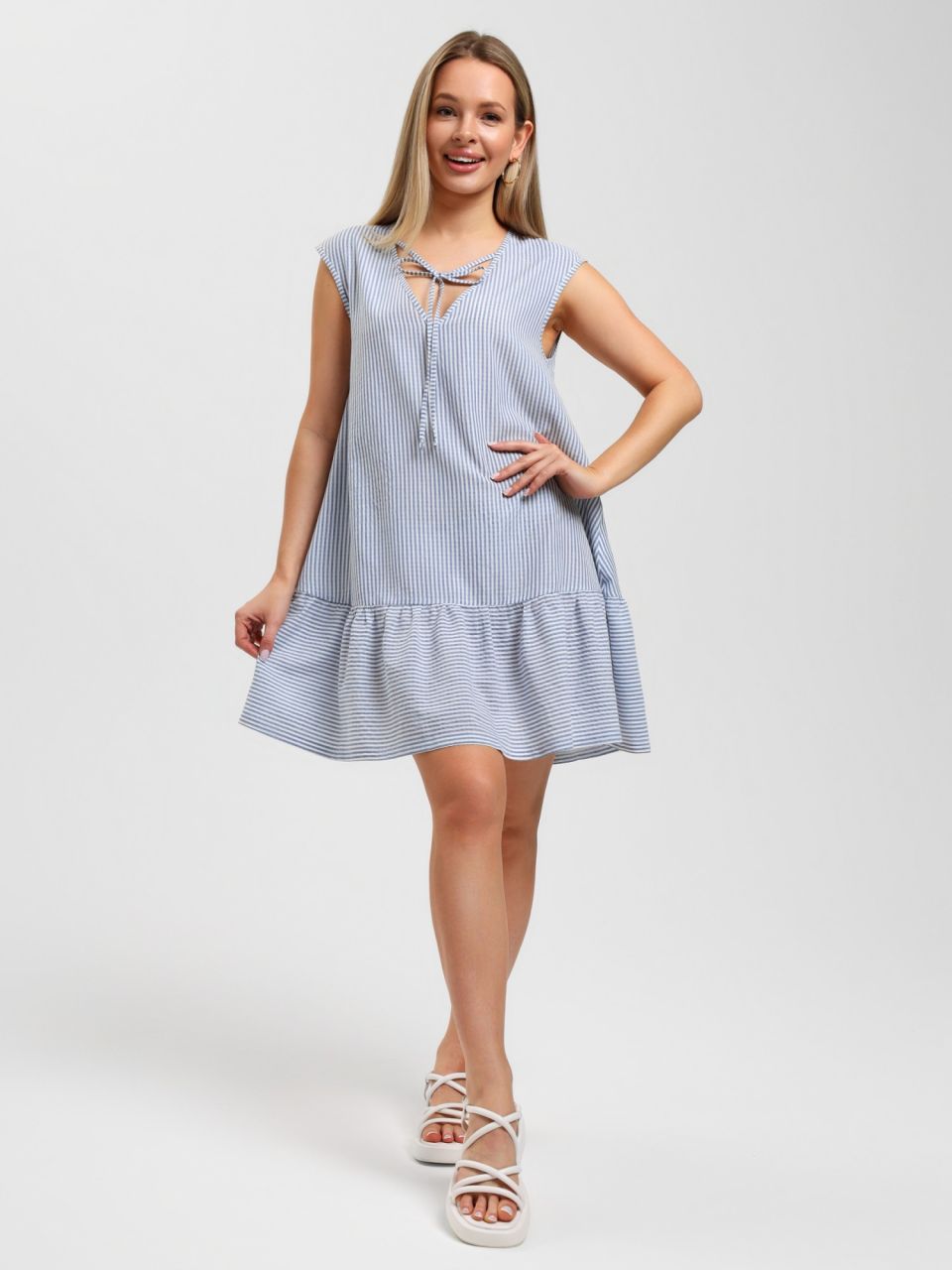 Платье молодежное, свободного покроя, с V- образным вырезом горловины, без рукавов. Горловина и проймы окантованы основным материалом, низ изделия с притачной оборкой. Акцентной деталью платья являются узкие завязки, вставленные в горловину с изнаночной стороны, завязывающиеся на бант спереди, которые при желании изменить внешний вид изделия, могут быть убраны вовнутрь.