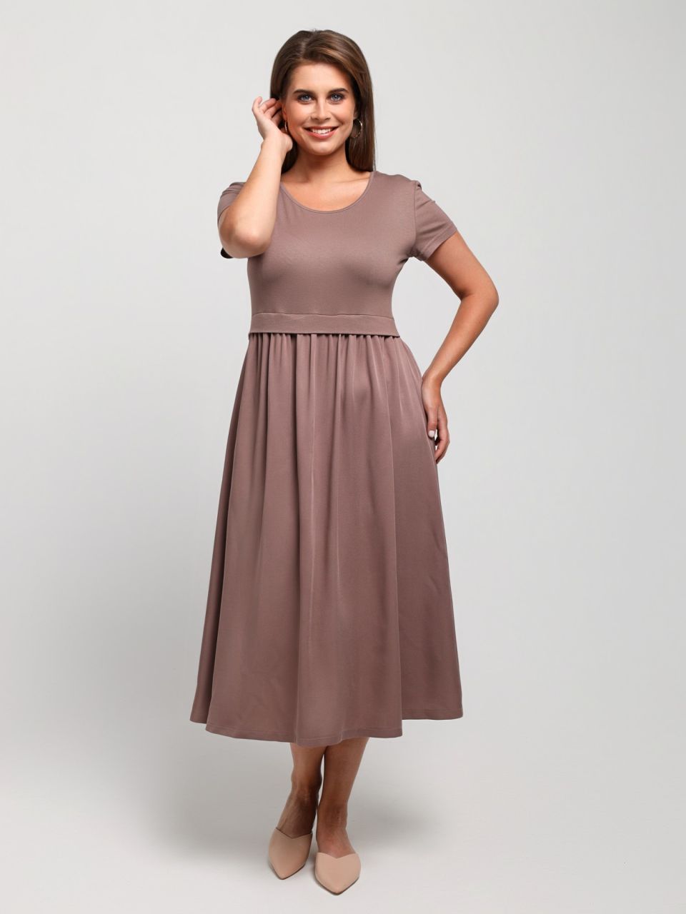 Платье женское отрезное по линии талии в комбинации двух видов гладкокрашеной ткани, в единой цветовой гамме: вискозного полотна (лиф) и плательной штапельной ткани (юбка), удлиненное, с короткими втачными рукавами, горловиной овальной формы, окантованной основным материалом и декоративной планкой в шве соединения лифа с юбкой. Юбка по шву соединения с лифом присборена.