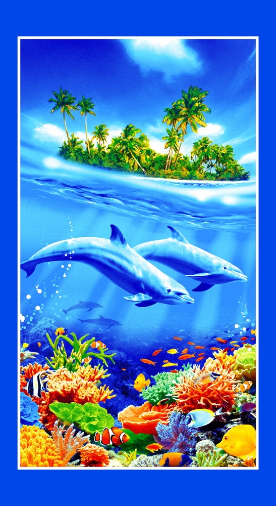 На вафельной хлопковой основе изображена пара дельфинов, которые резвятся вблизи от острова.