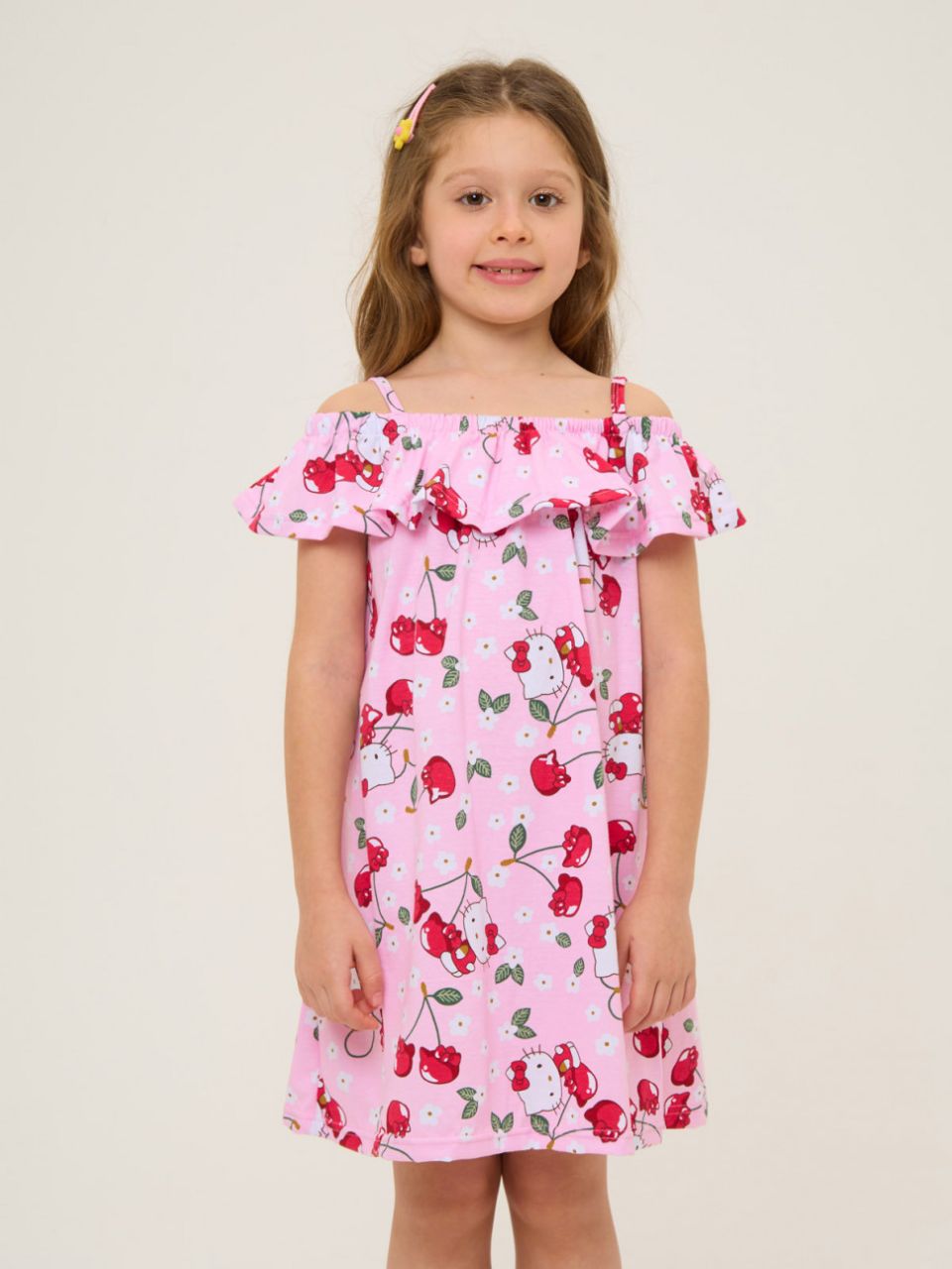 Лёгкий детский сарафан из мягкого хлопка с забавным принтом Hello Kitty и вишенками. Открытые плечи и волан создают нежный, летний образ. Ткань дышит и приятна к телу, не раздражает кожу. Удобный фасон подойдёт для прогулок и отдыха в жаркие дни.